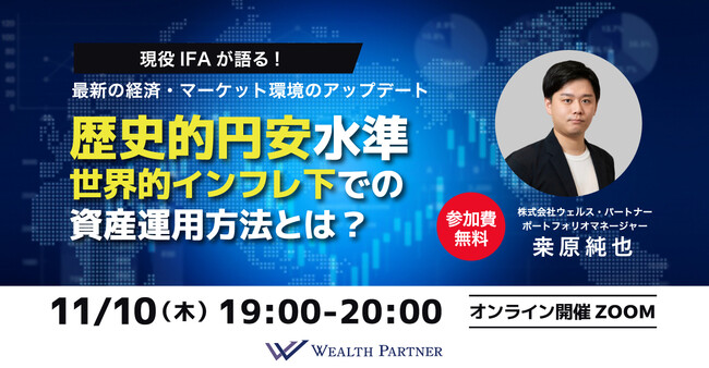 富裕層向けにIFA事業始め、資産運用のコンサルティングを行う株式会社ウェルス・パートナー(代表取締役:世古口俊介、本社:東京都港区、以下「当社」)は、オンラインセミナー「現役IFAが語る!最新の経済・マーケット環境のアップデート 歴史的円安水準・世界的インフレ下での資産運用方法とは」を2022年11月10日(木)19:00〜20:00に開催いたします。