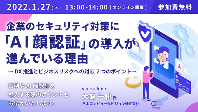 2022年1月27日(木)オンラインセミナー開催のお知らせ企業のセキュリティ対策に「AI顔認証」の導入が進んでいる理由〜DX化推進とビジネスリスクへの対応2つのポイント〜