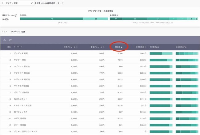 さらに、特定のワードを検索した人がその前後でどんなワードを検索する傾向があるのかを分析できる「DS.INSIGHT」の「時系列キーワード」を使って、あるポケモンの対策について検索した人が他にどんな検索をしているのかを分析しました。今回は「ザシアン」を例に分析したところ、「ザシアン 対策」と検索した人は、「ランドロス 育成論」「レジエレキ 育成論」などを検索する傾向にあることがわかり、プレイヤーたちがどんなポケモンで「ザシアン」に挑もうとしているのかを垣間見ることができました。
