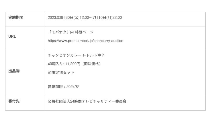株式会社モバオク(本社:東京都渋谷区、代表取締役社長:生田目 知之、以下モバオク)が運営するオークションサービス「モバオク(https://www.mbok.jp/ )」にて、チャンピオンカレーチャリティーオークションを、2023年6月30日(金)から開始します。