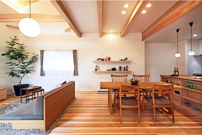 梁の見えるリビングは、木の香りに包まれ、リラックスできる空間に。