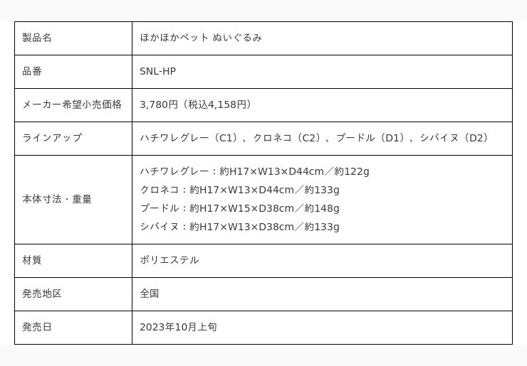 ナカバヤシ株式会社(本社:大阪市中央区、社長:湯本秀昭)は株式会社サンレモン(本社:東京都豊島区、社長:白鳥聡)と共同開発した、まるで本物のペットのようなぬくもりを感じられるぬいぐるみ「ほかほかペット ぬいぐるみ」を2023年10月上旬より全国で発売します。