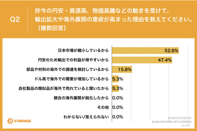 Q1で「かなり高まった」「やや高まった」と回答した方に、「Q2.昨今の円安・資源高、物価高騰などの動きを受けて、輸出拡大や海外展開の意欲が高まった理由を教えてください。(複数回答)」(n=19)と質問したところ、「日本市場が縮小しているから」が52.6%、「円安のため輸出での利益が得やすいから」が47.4%、「部品や材料の海外での調達を検討しているから」が15.8%という回答となりました。