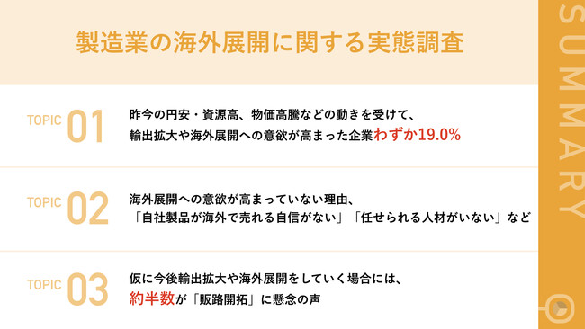 昨今の円安・資源高、物価高騰などの動きを受けて、輸出拡大や海外展開への意欲が高まった企業はわずか19.0%の結果となり、意欲が高まらない理由として、「自社の製品が海外で売れる自信がない」や「任せられる人材がいない」など、高いハードルを感じている実態が伺えました。仮に今後、輸出拡大や海外展開をしていくとしても、約半数から「販路開拓」に懸念の声が挙がっていることから、国内市場における厳しさを感じても海外展開にまで目を向ける製造業は少ないことが分かりました。