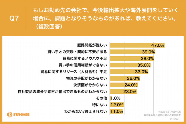 「Q7.もしお勤め先の会社で、今後輸出拡大や海外展開をしていく場合に、課題となりそうなものがあれば、教えてください。(複数回答)」(n=100)と質問したところ、「販路開拓が難しい」が47.0%、「買い手との交渉・契約に不安がある」が39.0%、「貿易に関するノウハウ不足」が38.0%という回答となりました。