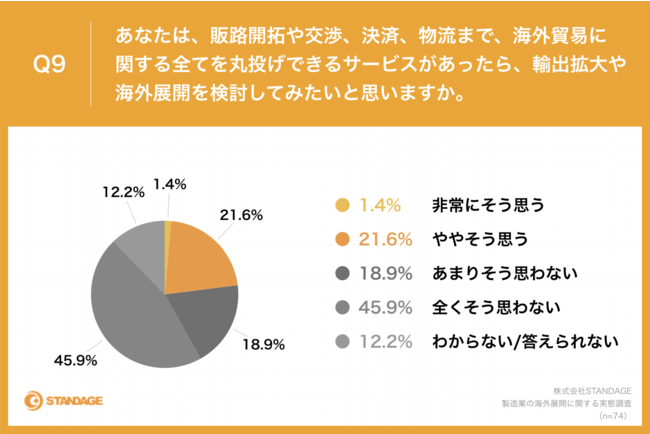 Q1で「あまり高まっていない」「全く高まっていない」と回答した方に、「Q9.あなたは、販路開拓や交渉、決済、物流まで、海外貿易に関する全てを丸投げできるサービスがあったら、輸出拡大や海外展開を検討してみたいと思いますか。」(n=74)と質問したところ、「非常にそう思う」が1.4%、「ややそう思う」が21.6%という回答となりました。