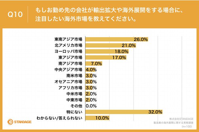 「Q10.もしお勤め先の会社が輸出拡大や海外展開をする場合に、注目したい海外市場を教えてください。」(n=100)と質問したところ、「東南アジア市場」が26.0%、「北アメリカ市場」が21.0%、「ヨーロッパ市場」が18.0%という回答となりました。