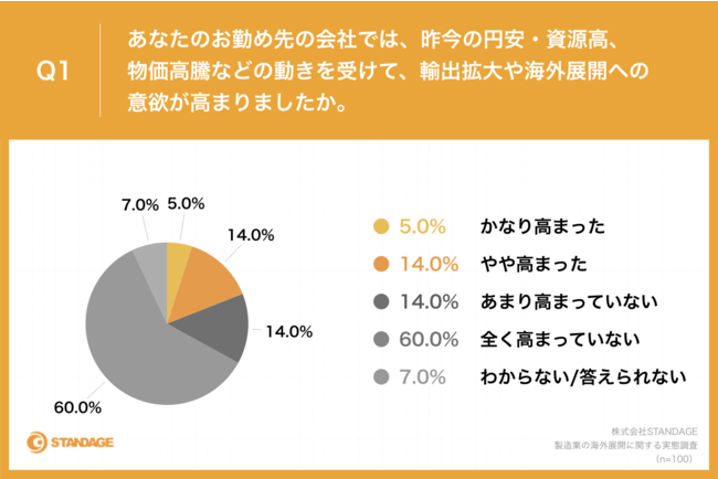 「Q1.あなたのお勤め先の会社では、昨今の円安・資源高、物価高騰などの動きを受けて、輸出拡大や海外展開への意欲が高まりましたか。」(n=100)と質問したところ、「かなり高まった」が5.0%、「やや高まった」が14.0%という回答となりました。