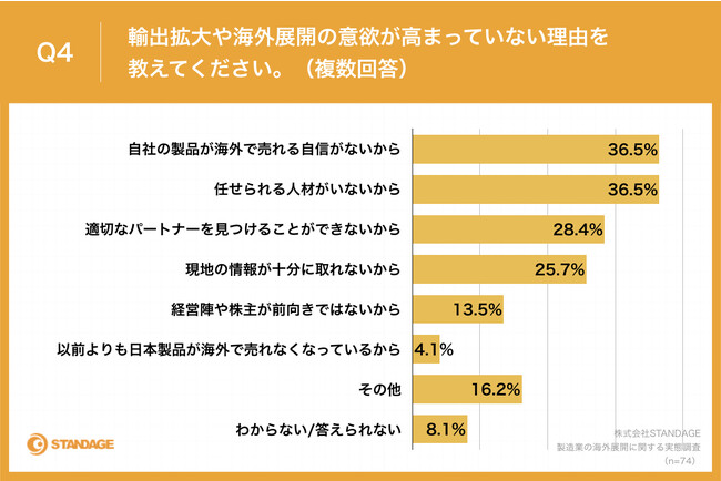 Q1で「あまり高まっていない」「全く高まっていない」と回答した方に、「Q4.輸出拡大や海外展開の意欲が高まっていない理由を教えてください。(複数回答)」(n=74)と質問したところ、「自社の製品が海外で売れる自信がないから」が36.5%、「任せられる人材がいないから」が36.5%、「適切なパートナーを見つけることができないから」が28.4%という回答となりました。