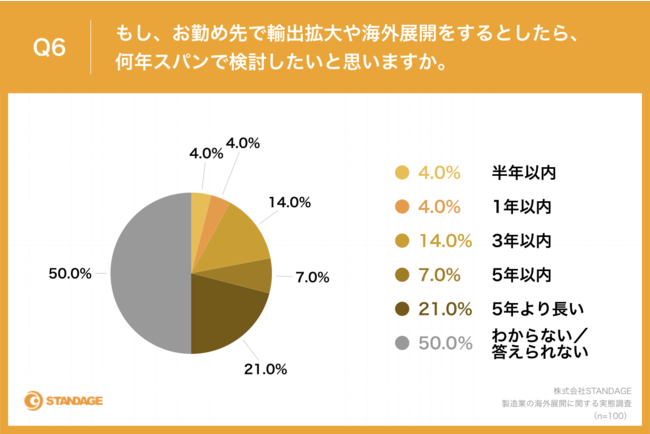 「Q6.もし、お勤め先で輸出拡大や海外展開をするとしたら、何年スパンで検討したいと思いますか。」(n=100)と質問したところ、「3年以内」が14.0%、「5年より長い」が21.0%という回答となりました。