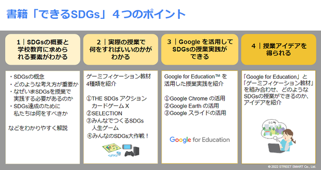 本書は、Google for Education を活用したSDGs教育を展開していく際の手助けとなることを目的としており、ゲーミフィケーション教材を活用することによって、SDGsを自分ごとに落とし込んだ授業実践が可能になります。SDGs教育をどのように行えば良いかわからない方やSDGs教育の新しい教材が必要な方、SDGsとICTを掛け合わせた授業を行いたい方など、幅広くサポートする書籍となっております。
