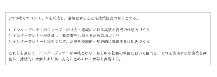 これらの実情を踏まえて、インタープレナーが自在に活躍し、様々な社会の単位において新産業の共創を推進していくことを可能にするため下記の提言を行いました。
