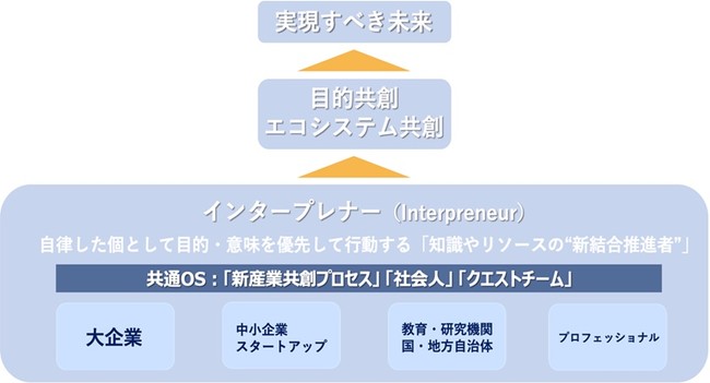 SUNDREDは2019年7月の「新産業共創スタジオ」のローンチ以来、多様な社会の単位において課題を解決し「実現すべき未来」を共創していくためには、全てのセクターに潜在している「インタープレナー」の活躍が不可欠であると考え、インタープレナーを中核とした新産業共創に取り組んできました。インタープレナーとは、多様なセクターとの対話を通じて社会起点の目的を共創し、それぞれが動かせるアセットを動かし、個々の組織だけでは実現できない繋がったソリューション(エコシステム)の構築を進めて目的を実現していく、新しいタイプの自律した「社会人」のことです。社会課題の解決、新しい目的の実現と、個々の組織の事業や果たすべき機能を結び付け、継続的に発展・進化させていくことで、組織においても重要な役割を担っていきます。