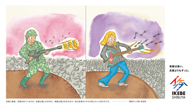 「楽器は強い。武器よりもずっと。」環境マンガ家 本田亮さんのイラストをイケシブで緊急展示!池部楽器店では全店でウクライナ緊急支援チャリティ企画を開始いたしました。