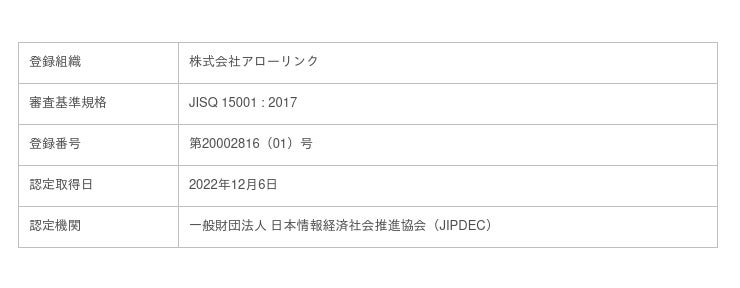 株式会社アローリンク:代表取締役社長 蓬莱 和真、以下:当社)は、一般財団法人日本情報経済社会推進協会(JIPDEC)より「プライバシーマーク」の認定を受けたことをお知らせいたします。