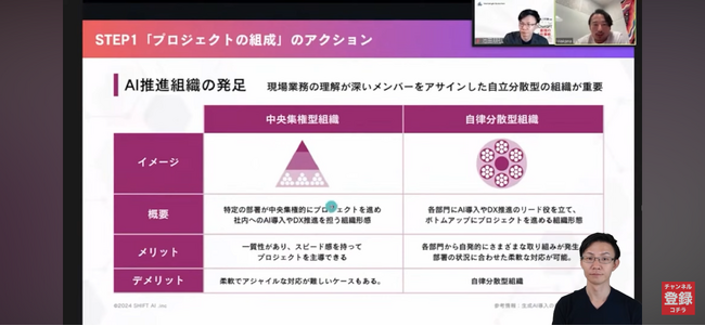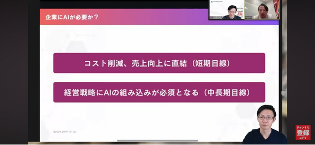 短期的な理由として、コスト削減や売上に寄与するという点を挙げ、中長期的には生成AI時代に適応するため経営戦略にAIの組み込みが必須となると語りました。