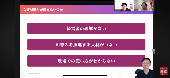 端的にまとめると、「経営者の理解がない」「AI導入を推進する人材がいない」「現場での使い方がわからない」の3つに収斂するとし、それぞれの層でAIリテラシーを高めていく必要があると話しました。