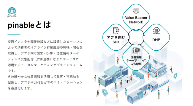 スイッチスマイルでは生活者の行動と体験のデータをビーコンとPOI位置情報マーケティングプラットフォーム「pinable」で収集しデータ活用基盤の構築を進めています。