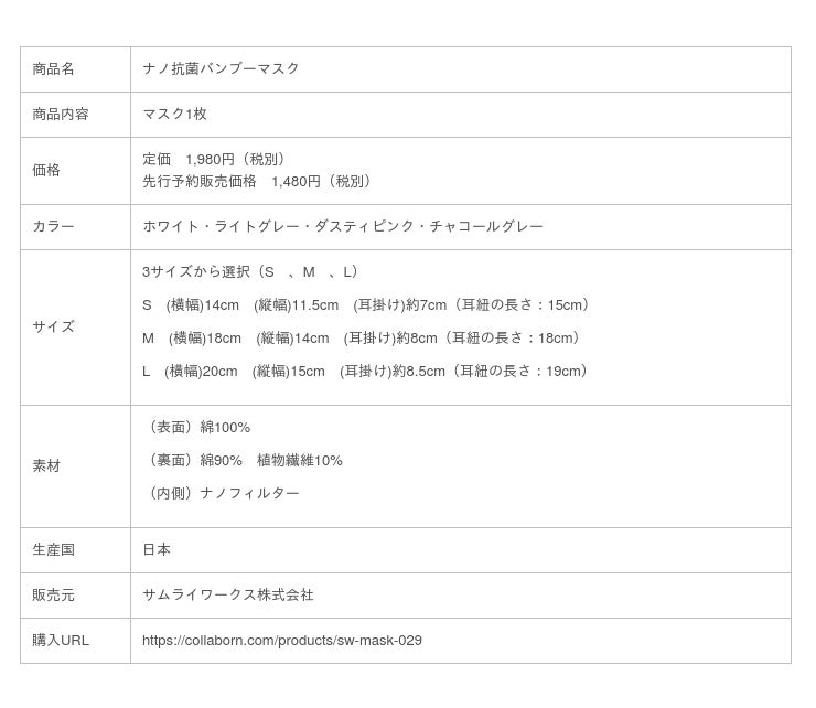 累計販売枚数20万枚を突破した「ナノクール抗菌マスク」などを展開するサムライワークス株式会社(東京都渋谷区)は、「ナノクール抗菌マスク」の秋モデルとして「ナノ抗菌バンブーマスク」を、先行1万枚で公式サイトにて予約販売を開始します。「ナノ抗菌バンブーマスク」は、継続して医療用レベルのナノフィルターを採用することで医療用レベルのコロナウイルス感染対策はもちろん、肌に接する面には天然竹繊維であるバンブーリネンを採用し、秋に多発する肌トラブルを優れた調湿性で対策できます。また通気性に優れており息がし易く、脱臭・抗菌の効果もあります。