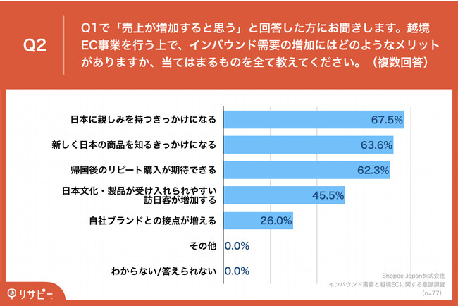 Q1で「売上が増加すると思う」と回答した方に、「Q2.越境EC事業を行う上で、インバウンド需要の増加にはどのようなメリットがありますか、当てはまるものを全て教えてください。(複数回答)」(n=77)と質問したところ、「日本に親しみを持つきっかけになる」が67.5%、「新しく日本の商品を知るきっかけになる」が63.6%、「帰国後のリピート購入が期待できる」が62.3%という回答となりました。