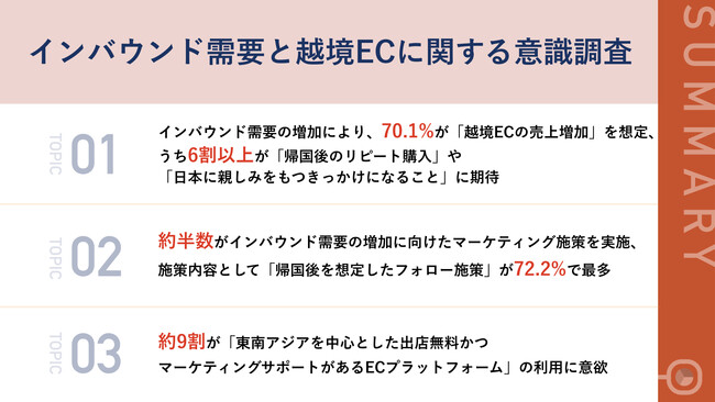 インバウンド需要の増加により、越境EC事業の担当者の70.1%が「越境ECの売上増加」を想定しており、さらには6割以上が「帰国後のリピート購入」や「日本に親しみをもつきっかけになること」に期待していることが判明しました。