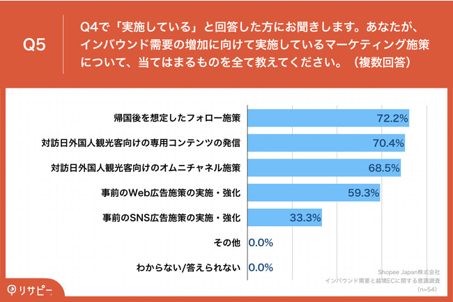 Q4で「実施している」と回答した方に、「Q5.あなたが、インバウンド需要の増加に向けて実施しているマーケティング施策について、当てはまるものを全て教えてください。(複数回答)」(n=54)と質問したところ、「帰国後を想定したフォロー施策」が72.2%、「対訪日外国人観光客向けの専用コンテンツの発信」が70.4%、「対訪日外国人観光客向けのオムニチャネル施策」が68.5%という回答となりました。