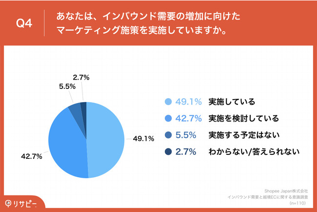 「Q4.あなたは、インバウンド需要の増加に向けたマーケティング施策を実施していますか。」(n=110)と質問したところ、「実施している」が49.1%、「実施を検討している」が42.7%という回答となりました。