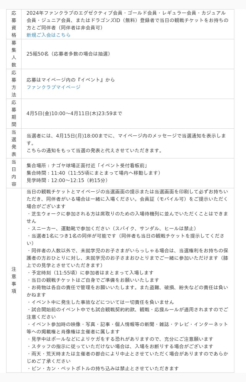 ドラゴンズのバッティング練習を中心に、バックネット裏スタンドから見学する「ドラゴンズ打撃練習見学会」を行います。