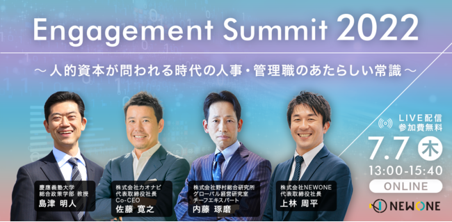 人材育成・組織開発サービスを提供する株式会社NEWONE(本社:東京都千代田区 代表取締役:上林周平、以下NEWONE https://new-one.co.jp/)は、2022年7月7日、今年で3年目を迎えたエンゲージメント・サミット2022〜人的資本が問われる時代の人事・管理職のあたらしい常識〜 を開催し、350名を超える方にご参加をいただきました。