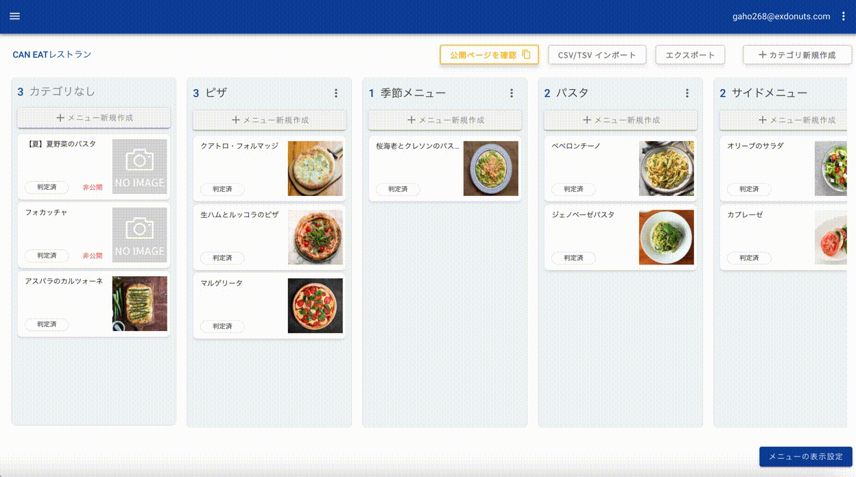 メインメニュー・サイドメニュー・デザートなど必要なカテゴリを自由に設定。アレルギー情報のチェックがますます楽に