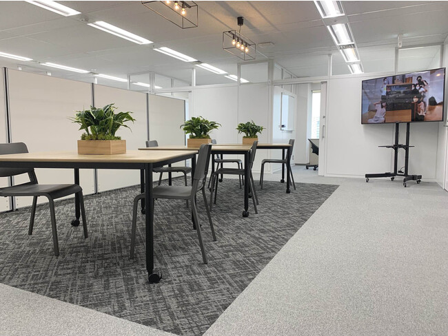 通路を挟んでエントランスと反対側の部屋に入ると、開放的な待合スペースがあります。大きなスクエアのテーブル3台とモニターがあります。