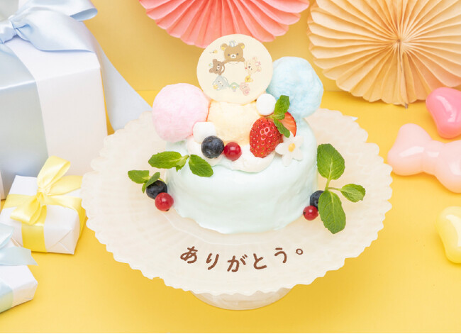 フルーツやわたあめに囲まれたリラックマたちのお祝いケーキ。