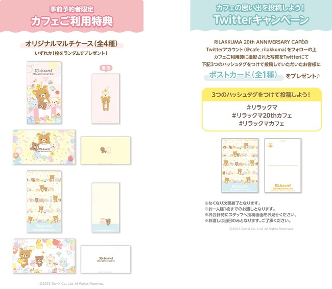 その他、カフェオリジナルグッズや特典、Twitterキャンペーンなども設け「リラックマ20周年」を盛り上げます。