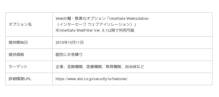 アルプス システム インテグレーション株式会社(本社:東京都大田区、代表取締役社長:永倉 仁哉、以下ALSI〔アルシー〕)は、Webフィルタリングソフト「InterSafe WebFilter(インターセーフ ウェブフィルター)」のWeb分離・無害化オプション「InterSafe WebIsolation(インターセーフ ウェブアイソレーション)」を、2019年10月11日より提供開始します。