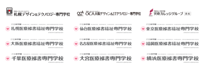 OCA大阪デザイン&ITテクノロジー専門学校、札幌デザイン&テクノロジー専門学校、仙台デザイン&テクノロジー専門学校、京都デザイン&テクノロジー専門学校、専門学校穴吹コンピュータカレッジ、札幌医療秘書福祉専門学校、仙台医療秘書福祉専門学校、東京医療秘書福祉専門学校、千葉医療秘書専門学校、大宮医療秘書専門学校、横浜医療秘書専門学校、名古屋医療秘書福祉専門学校、大阪医療秘書福祉専門学校、福岡医療秘書福祉専門学校