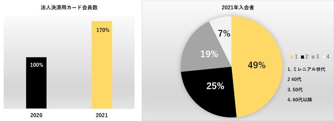 特に年会費が高いカードの入会が増えています。中でも2021年は法人口座決済用カード会員の伸びが目覚ましく、会員数が昨年に比べ1.7倍増加しました。とりわけ、コロナ禍でありながら年会費の高い法人Gold Card(年会費22万税込)の会員数が1.7倍と伸びています。当社のヒアリングによると支持されている理由として、金属製であること、納税でもポイントがショッピング同様に貯まる高還元率のポイントプログラム、高額納税が可能であること、きめ細かいコンシェルジュサービス、ユニークな優待、会員同士の繋がりを重視するサービスなどが理由に挙げられました。法人口座決済用カードの伸びにより、全体の利用額は今後さらに伸びていくと予想されます。また、2021年入会の会員はミレニアル世代が49%、次いで40代が25%、50代が19%、60代以降が7%となり、