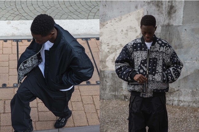 F.M.C.Dの代表的アイテムであるボンバージャケットの表地に、MIYAGIHIDETAKAオリジナルバンダナ6柄を大胆に使用したデザインはストリートに映えるデザインとなっています。