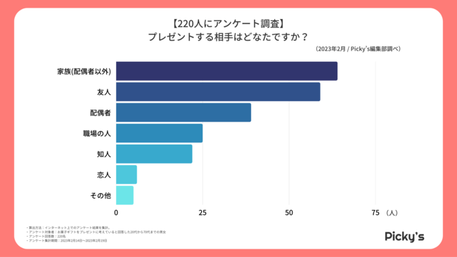 またどんな時にプレゼントをしようと思ったのか具体的な目的も回答してもらったところ、「家族」を選ばれた人は、バレンタインデーやお祝い事など、イベントでのプレゼントとして考えているという回答が一番多く挙がりました。