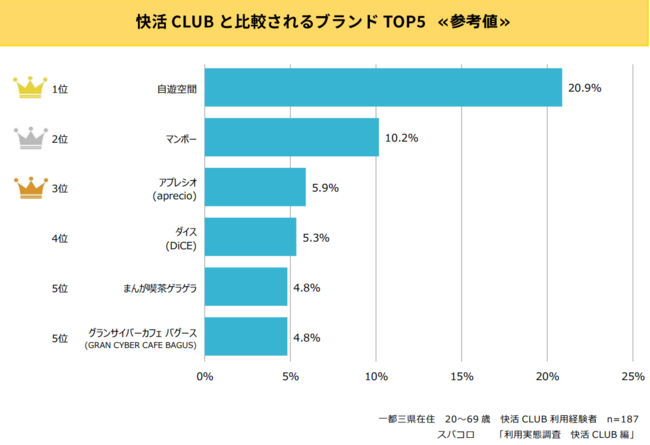 快活CLUBの比較対象となったブランドは上位から、「自遊空間」(20.9%)でした。次いで「マンボー」(10.2%)、「aprecio(アプレシオ)」(5.9%)、「DiCE(ダイス)」(5.3%)が続く結果となりました。