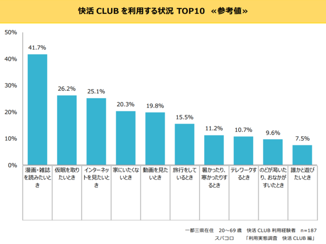 快活CLUBを利用する状況では、上位から「漫画・雑誌を読みたいとき」(41.7%)、「仮眠を取りたいとき」(26.2%)、「インターネットを見たいとき」(25.1%)、「家にいたくないとき」(20.3%)が続いています。