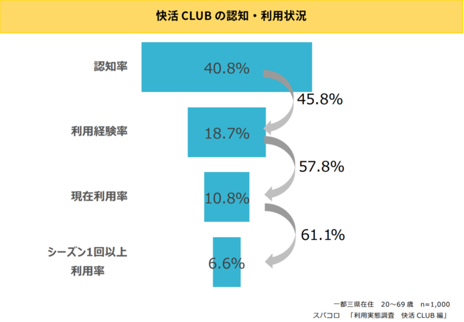 一都三県在住の20〜69歳の1,000人に聞いた快活CLUBの浸透状況についてみてみると、認知率40.8%、利用経験率18.7%、現在利用率10.8%、シーズン1回以上利用率6.6%という結果に。