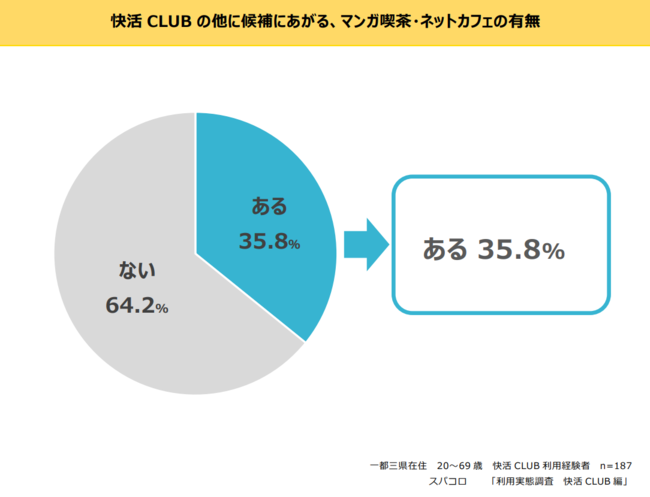 『快活CLUBを利用する時に、快活CLUBと比較して利用するか迷うマンガ喫茶・ネットカフェはありますか』という質問に対して、「ある」と回答した人は、 快活CLUBの購入経験者のうち35.8%、これに対し「ない」と回答した人の割合は64.2%。快活CLUBユーザーの6割以上がマンガ喫茶・ネットカフェの利用を考えるとき、迷わず快活CLUBを選択していることがわかります。