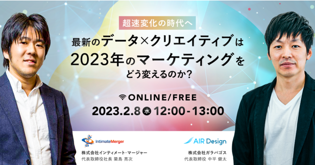 国内最大級パブリックDMPを提供するデータプラットフォームカンパニーの株式会社インティメート・マージャー(本社:東京都港区、代表取締役社長:簗島 亮次、以下当社)は、マーケティングのプロによるAIを活用した広告クリエイティブ制作・改善サービス「AIR Design」を展開する株式会社ガラパゴス(本社:東京都千代田区、代表取締役:中平 健太、以下ガラパゴス)と共催セミナー「【超速変化の時代へ】徹底討論!最新の“データ×クリエイティブ”は2023年のマーケティングをどう変えるのか?」を2023年2月8日(水)12時より実施することをお知らせします。