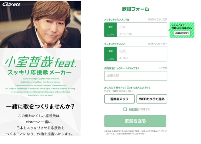 リニューアルを記念し、「スッキリジャパン 応援歌キャンペーン! 小室哲哉と応援歌をつくって豪華賞品を当てよう!」を実施します。「日本にはスッキリが必要だ」をスローガンに昨年設立した、世の中のあらゆる「スッキリ」を調査・研究、発表する「Cloretsスッキリ総研」が、「スッキリ応援歌メーカー」を小室哲哉さんと共同開発しました。キャンペーン専用ウェブサイトにアクセスし、スッキリしたい人・事柄、作詞家名を入力するだけで、自分自身や家族、友人に宛てたスッキリ応援歌ムービーが作成できます。「Cloretsスッキリ総研」は、日本国民のスッキリした生活を応援する日本代表を目指し、人々にパワーを与える数々の名曲を世の中に送り続けてきた小室さんとコラボレーションすることで、日本中にスッキリをお届けします。作曲を担当した小室さんは、「日本中をスッキリさせる応援歌が完成しました。このスッキリ応援歌で、みなさんも誰かを応援してください!」と語っています。さらに、キャンペーン専用ウェブサイトで応援歌ムービーを作成し、応募した方の中から抽選で1名様に150万円相当の金のミニメガホンが当たる他、合計1,101名様にスッキリ応援グッズが当たります。