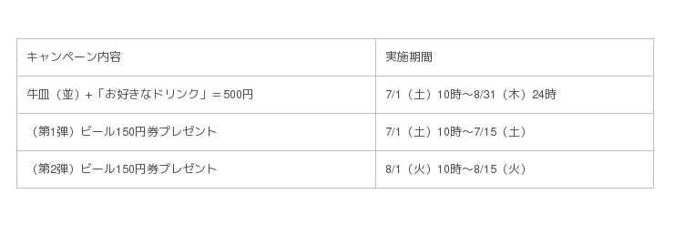 期間中、「牛皿(並)」と「お好きなドリンク」1杯を500円で販売いたします。合わせて「ビール150円券」を