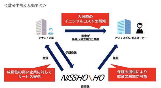日商保はオフィス・店舗など事業用不動産の賃貸に関わる預託敷金(保証金)を積極的な事業投資に活用できる敷金減額保証サービスを提供しております。万が一テナントに倒産・破産などの賃料不払いが生じた場合には、日商保がオフィスの賃料債務・原状回復費などを保証することを前提に、入居企業の預託敷金を半額にでき、入居する企業は敷金という入居・移転に際し必要な初期費用を抑え、その減額分の資金を事業に有効活用することができます。