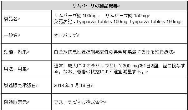 アストラゼネカ株式会社(本社:大阪市北区、代表取締役社長:ステファン・ヴォックスストラム、以下、アストラゼネカ)は本日、「白金系抗悪性腫瘍剤感受性の再発卵巣癌における維持療法」を効能・効果とした「リムパーザ錠」(300mg1日2回投与)(一般名:オラパリブ、以下、「リムパーザ」)の国内における製造販売承認を取得したことをお知らせします。リムパーザは、本邦初のポリ(ADP-リボース)ポリメラーゼ(PARP)阻害剤です。