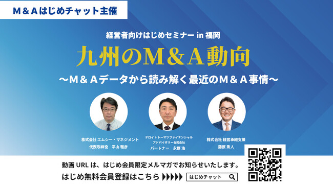現役のプロフェッショナルによるM&A事例や最新動向、家族信託、勇退支援など、M&A・事業承継をテーマにセミナーをオンラインで開催します。今月は、『九州のM&A動向』をテーマにお届けします。
