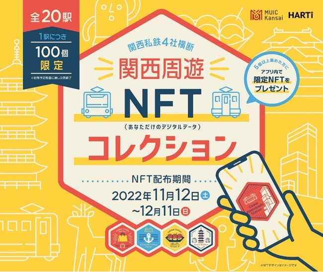 Web3関連技術で新しい文化・芸術市場のエコシステム創造を目指す株式会社HARTi(代表取締役 、以下 当社)と一般社団法人関西イノベーションセンター(代表理事 、以下 関西イノベーションセンター)は、NFTを活用した関西の駅周遊施策(以下 本施策)を、2022年11月12日(土)より開始します。