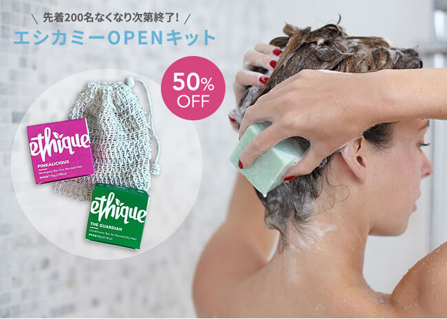 オープンを記念し、NZ発サステナブルなビューティーバーブランド「Ethique(エティーク)」の固形シャンプー&コンディショナーに、エシカミーオリジナルソープポーチがついたスペシャルなキットを販売中です。